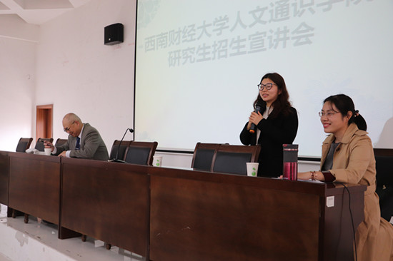 西南财经大学人文通识学院师资力量雄厚,尤其在毕业生就业率、市场竞争力方面均位居全国同类财经院校前列,在国内大学中享有盛誉。会上,詹海云教授首先从地理位置、教学环境学生管理、师资力量、研究生教育等几个方面对本学院基本情况进行详述,他指出人文通识学院在学生管理方面严抓不懈,重点推进科研、文化中内外深度交流,加强对学生的深造力度,致力于挖掘学生跨领域发展、视野国际化等多方面潜力。结合自身学术研究,詹海云教授文化传承角度,对中国深厚传统文化及内涵进行辩证考察,解析民俗学方法论在民俗民风方面的具体应用。随后,潘斌教授就研究生招生政策以及考研专业问题作出具体阐述,他指出要充分发挥专业优势,结合自身实际与未来专业前景选取适合自己的考研专业和发展方向。宋晓希老师向同学们重点推荐与专业联系较为密切的经济哲学与传统文化哲学专业,并针对人文通识学院研究生奖助体系、专项计划以及就业创业等方面一一回答同学们提出的问题。