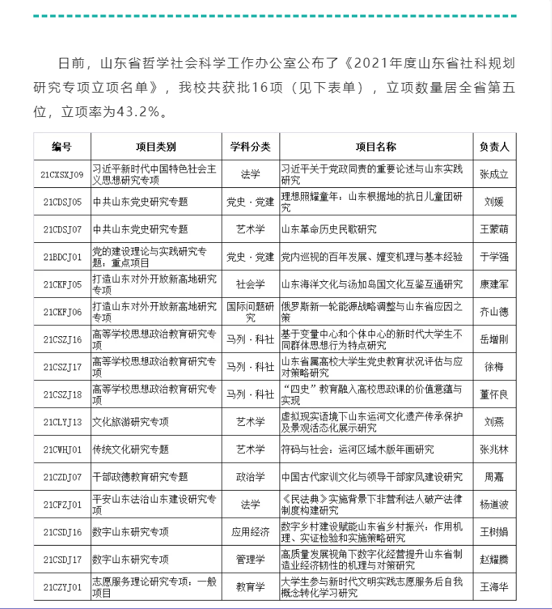 日前,山东省哲学社会科学工作办公室公布了《2021年度山东省社科规划研究专项立项名单》。