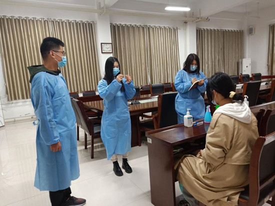 演练现场,“班级负责人”“学院联络员”“值班医生”“辅导员”“党总支书记”之间的沟通及实操,学生演员们向观摩人员展示了学生在宿舍及教室区域出现身体异常,应如何正确处理,如何做到“及时上报—冷静处理—高效就诊—科学消杀”。