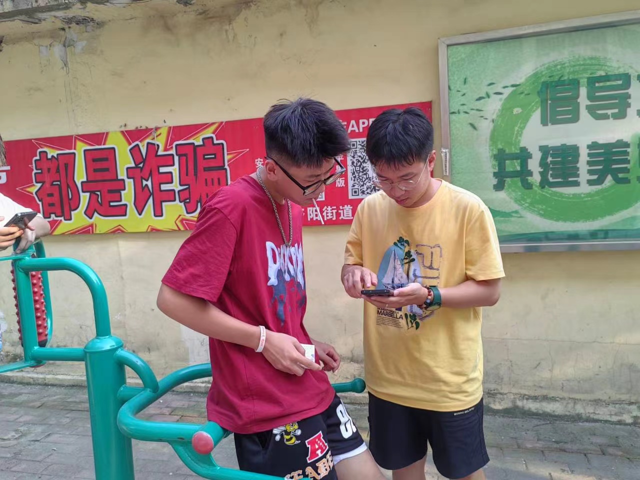 活动参与者按照活动规定时间在社区大门前集合,认真聆听活动负责人侯海博对本次活动流程详细介绍。侯海博带领参与者进入社区,从防诈宣传角讲解防诈骗的相关知识和国家反诈中心APP的运用。在进行社区走访调研的过程中,走访人员发现,多数返乡大学生对于常见的诈骗方式、防范措施和应对方法有着自己的见解和方法,能够有效地防范诈骗等侵害自己合法权益的不法行为,但仍有少部分大学生对于诈骗只有笼统的概念,并没有具体的、实际的方法防范和应对诈骗。针对防范意识淡薄的大学生,参与人员对其进行相关知识的讲解并监督其下载注册国家反诈中心APP。随后,活动负责人许哲宁对活动参与人员及走访大学生进行分组,为各组提供真实案例进行探讨交流,由参与者彼此分享自己的防诈经验或成果。参与者房家豪表示,通过本次实践活动,不但认识到增强防诈意识和能力的重要性,并且深刻体会到防诈骗宣传工作的不易。