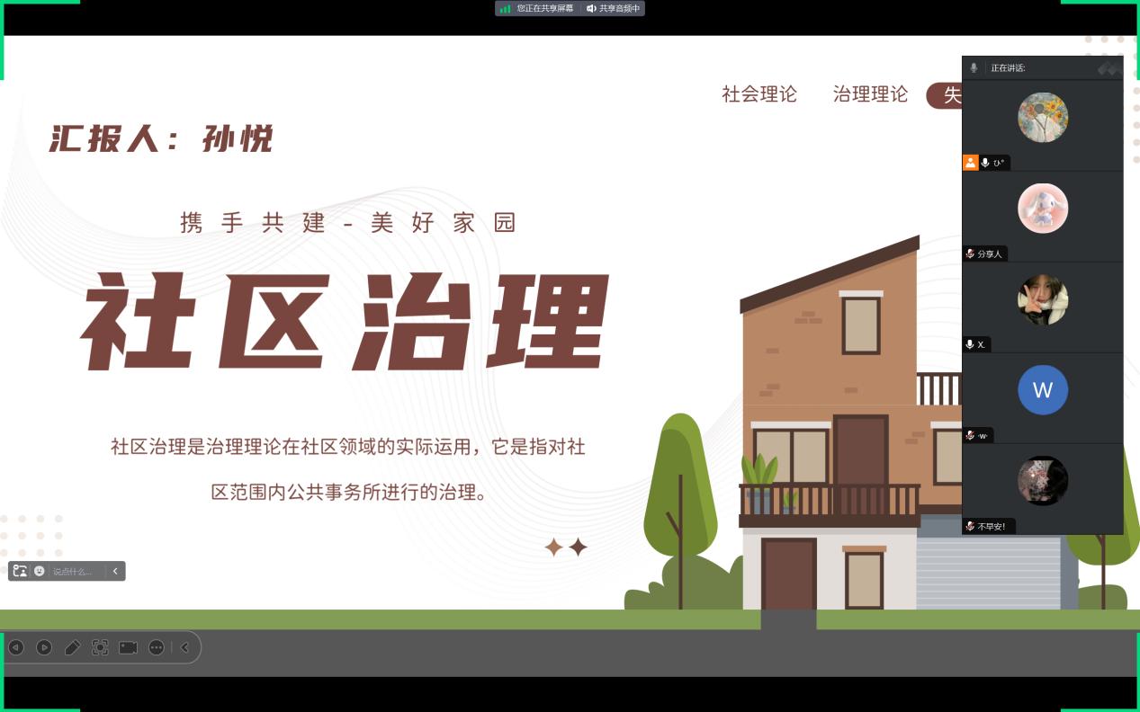 活动负责人孙悦将整理好的有关社区治理与发展的资料,投放在PPT上,方便参与者的观看。接着,孙悦向本次活动的参与者说明此次活动的目的是广泛征集参与者对社区治理的看法以及收集建议,并向他们普及社区治理的重要性,让他们更加重视社区的地位。孙悦介绍此次活动的流程,主要分为以下五个部分:介绍社区的历史及由来、当前社区存在的问题、社区治理未来的规划及方案、集思广益、发表个人看法。参与者们对孙悦讲述社区在五千年文明中的发展历程较为感兴趣,并踊跃向孙悦提出自己的疑问。在集思广益这一环节中,参与者积极发表自己对社区治理的建议以及他们所观察到的社区现状所存在的问题,尤其是社区公共资源的利用以及如何进行公平分配的问题居多数。活动负责人孙悦就这一问题阐明了自己的看法,同时强调了社区治理的地位及重要性,参与者积极配合活动负责人回答相关问题,并与其他参与者共同讨论问题的解决方案。