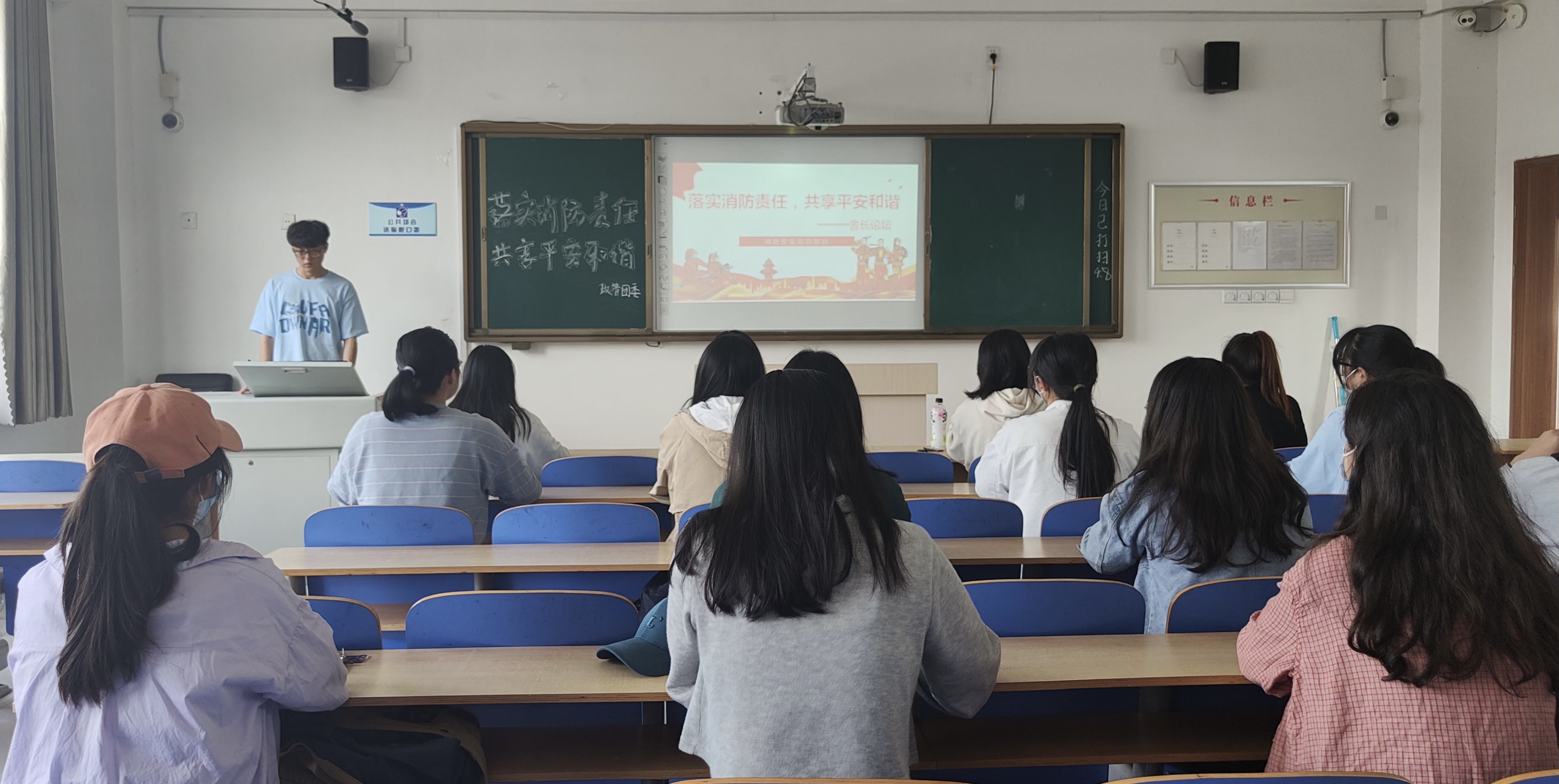 组织者用近几年数据告诉大家宿舍是火灾隐患存在较多的场所,掌握宿舍火灾突发险情的逃生技能和自救技能十分重要。同时组织者将宿舍用电规范细则下发,要求舍长们认真阅读,为消防安全培训相关工作和本次活动的开展做好准备。随后活动组织者播放消防员针对消防器材的介绍与使用视频,就火场逃生技巧等相关消防知识向同学们做出详细的讲解并邀请苏晴等同学上台表达自己的看法,实际感受干粉灭火器的使用方法。讲解结束后,同学们积极提出自己的疑问,如对于不同火灾下使用何种灭火器等问题,组织者对这些问题进行详细解答,从而进一步加深同学们对火灾安全的认识。交流后,组织者向各位舍长下发任务,舍长们回到宿舍仔细排查宿舍内的消防安全隐患,引导宿舍成员积极学习消防安全相关知识,做到从源头杜绝消防灾害的发生。