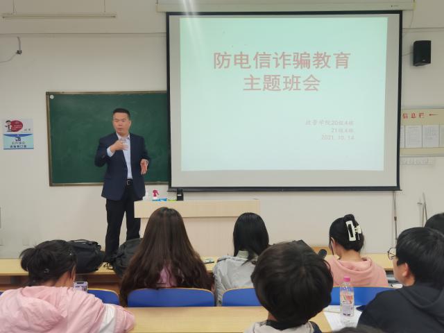秉持确保学生财产安全,增强学生防范网络电信诈骗的意识,全面普及校园防诈骗安全常识的态度,10月14日,政管学院各个班级在班主任的主持下召开防网络电信诈骗主题班会。