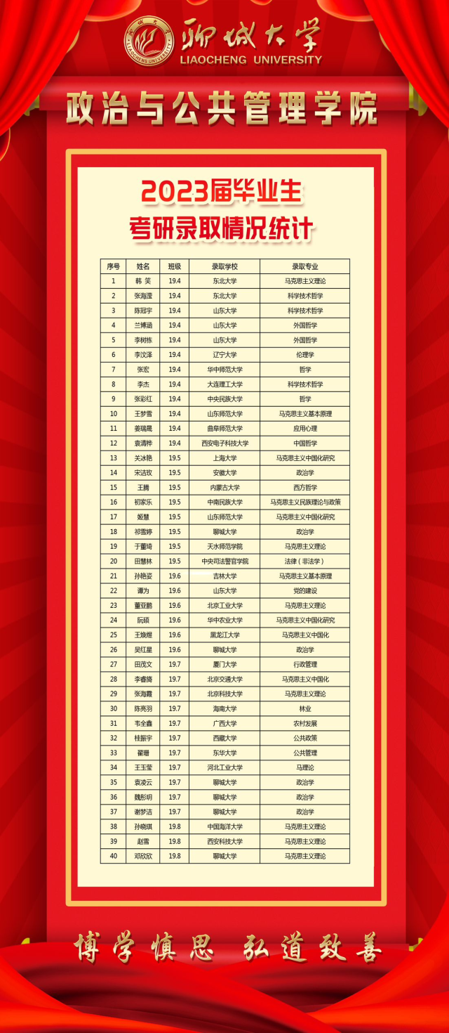 学院高度重视学生考研工作,成立考研工作领导小组,以工作组领航先行,全面负责指导、监督、管理学生考研工作,在全院教职员工的共同努力下,永利毕业生就业及考研情况呈现出良好的态势,连续三年考研报考率、升学率稳步提升。2023年永利集团88304官网开设哲学,政治学、经济学与哲学,行政管理专业。永利2023年毕业生共 170人,其中升学人数40人,30人考入厦门大学等双一流院校,总体升学率为23.5%。其中哲学专业升学12人,升学率为30.8%;政治学、经济学与哲学升学14人,升学率为21.2%;行政管理专业升学14人,升学率为22.2%。永利结合学院实际,不断探索与实践,考研工作成效显著,捷报频传,形成鲜明的特色和影响力。
