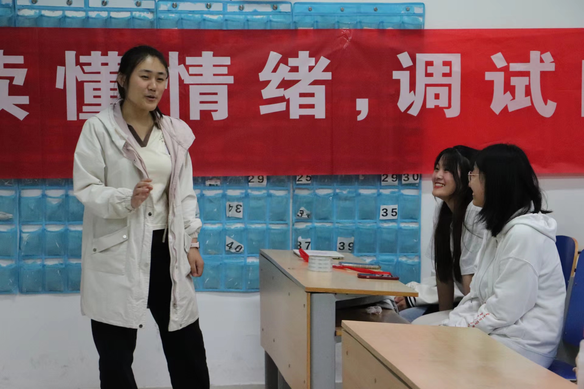主讲人张甜甜首先向同学们介绍情绪的定义,对情绪的表现形式进行具体说明,并邀请徐德正表演了情绪的三种表现形式面部表情、体态表情和语态表情。张甜甜以“情绪可以改变吗”为题,引导同学们思考自己所遇到的情绪能否变化,同时通过“秀才与棺材”的小故事、关于半瓶水的思考和情绪的ABC理论阐述情绪会因为诱发事件、个人信念想法以及个人的行为而发生改变,并以断句游戏“下雨天留客天留人不留”让同学们更加深刻体会到情绪的变化。张甜甜向同学们介绍调试情绪的方法——理智控制法,表示我们是情绪的主人,情绪不是我们的主人,大家要学会调整内心,克服坏情绪,成为最好的自己。李昱瑶表示:“通过今天的活动,我学会了认知自我,能够主动管理不良情绪,今后也会以更加良好的精神面貌投入到学习中去”。