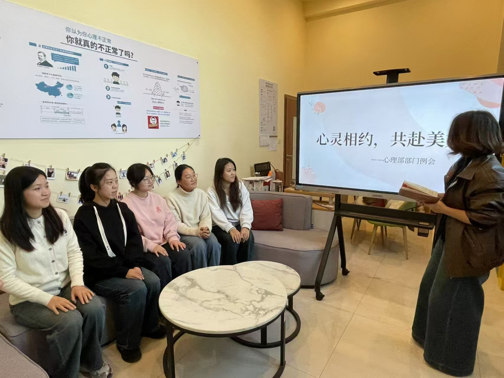 主讲人刘雅琪分别从“瑜伽的含义”、“瑜伽的好处”、“如何认识瑜伽”以及“注意事项”这四个方面展开详细叙述。刘雅琪通过PPT的形式向参与者们讲解,指出瑜伽是一种以一定心理实践为基础的生活哲学,能够使参与者保持身心之间的理想平衡,有效缓解压力和紧张感,提高同学们的身体和精神力量。刘雅琪向参与者们重点解释人们在瑜伽方面可能存在的认识误区,从而引导参与者们用正确的姿势进行瑜伽活动,帮助参与者减少在瑜伽练习过程中的受伤概率。随后,刘雅琪带领参与者们练习简易坐、至善坐、雷电坐、山式和拜日式站姿等动作,并通过播放轻音乐为参与者们营造更为舒缓的氛围,使参与者可以更好地投入瑜伽动作。在交流互动环节,参与者孔若茜表示,她在此次活动中深刻感受到瑜伽的魅力,身心都得到充分地放松,有助于集中注意力,增强认知控制和工作记忆,更好地感知自己的情感情绪。