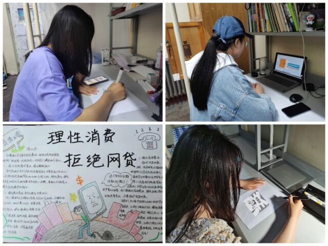 莫画“网”为牢,莫“贷”一生愁。在平面作品设计比赛中,同学们以“拒绝不良校园贷”为主题进行创作,参赛者们认真构图,用画笔展现对校园贷的警惕之情,用图片抒发自己的情感。同学们的作品都结合具体案例,以小见大,见微知著,作品形式多样,新颖别致,充分展示自己的艺术直觉,胡玉丽采用漫画的形式,用生动夸张的方式体现校园贷的恶劣后果,直接体现作者内心的真实想法;王临风则采用手抄报的方式,用清晰的排版、图文并茂的表达给人以视觉冲击;以及程莲坤采用海报形式,富有极强的感染力。每个作品都蕴涵着参赛者个人对校园贷的不满,表达出希望大学生远离校园贷、减少超前消费、促进生活美好的祝愿。活动负责人对优秀作品进行表扬,鼓励同学们远离消费贷款陷阱,树立正确消费观。