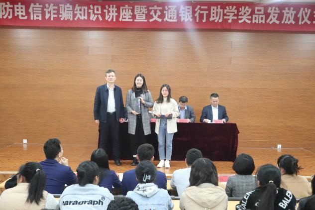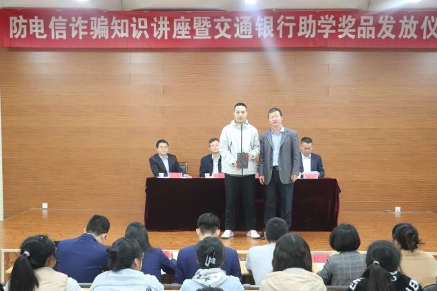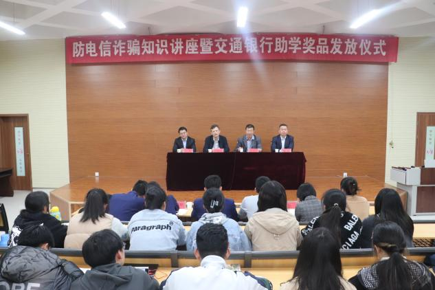 10月28日,永利集团88304官网举办防电信诈骗知识讲座暨交通银行助学奖品发放仪式,出席本次讲座的有交通银行聊城分行行长张贻陆、交通银行行长助理王凯、永利集团88304官网院长唐明贵、学院党总支副书记、副院长明辉,学院全体学生参加了讲座。