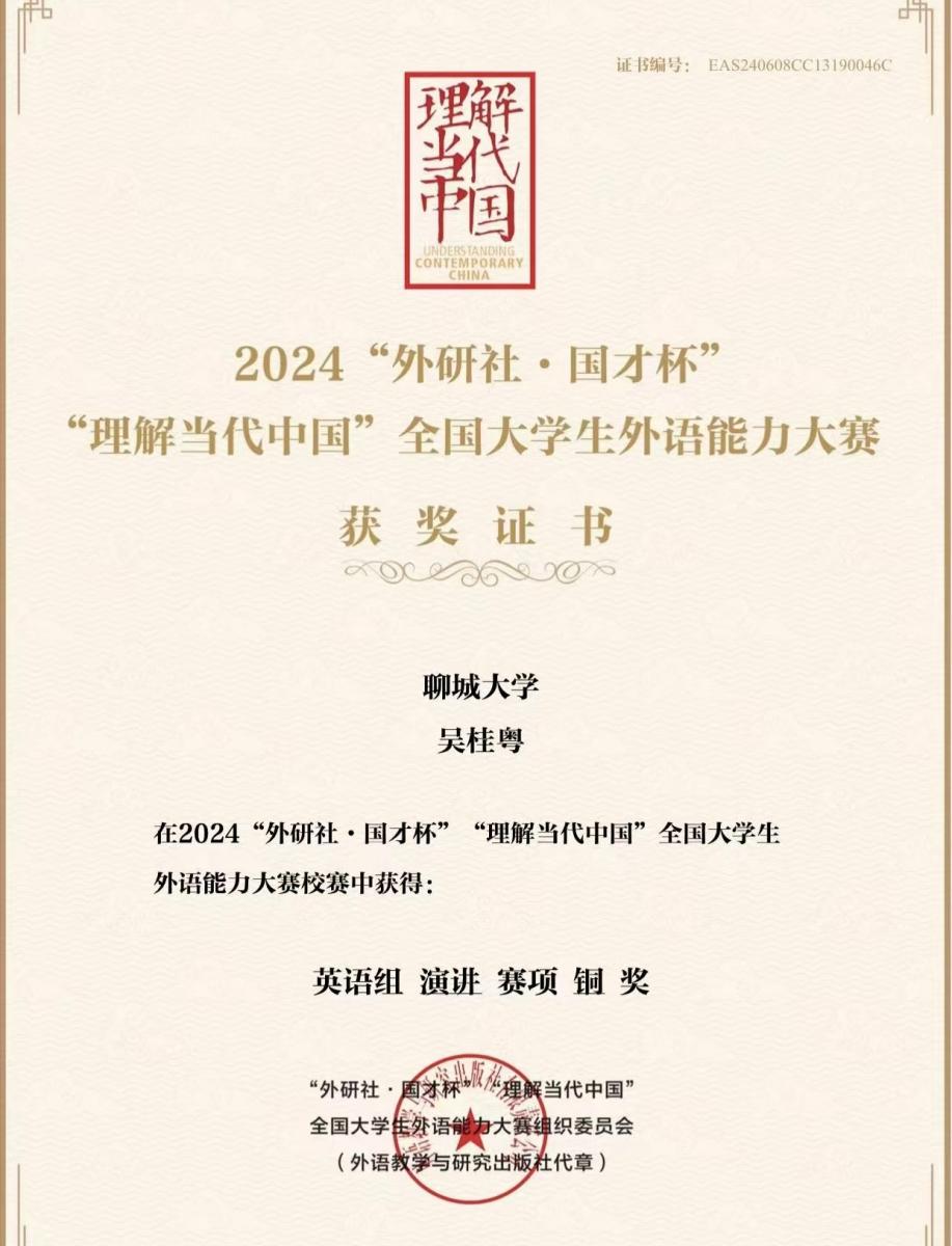 【资助育人取得实效】吴桂粤在“外研社·国才杯”中荣获演讲赛铜奖