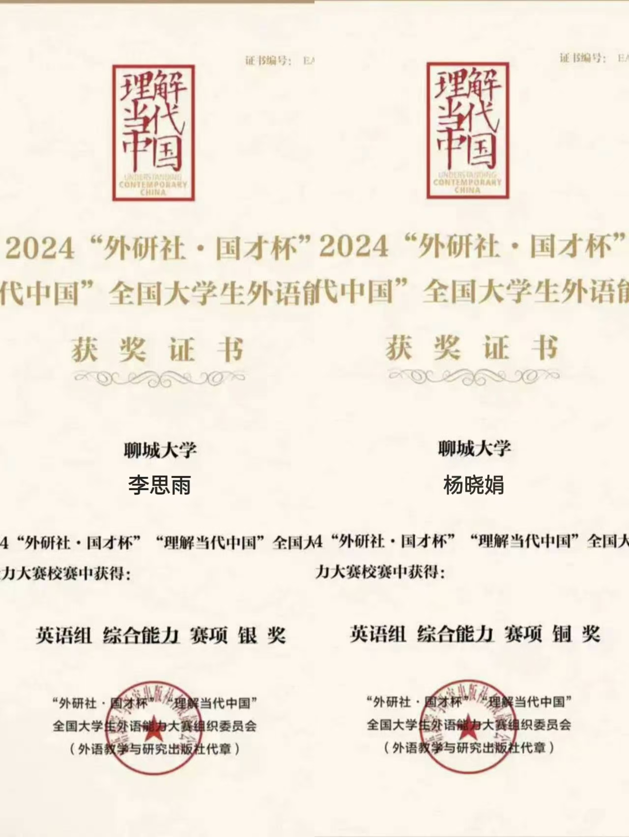 【资助育人取得成效】李思雨、杨晓娟在外研社·国才杯比赛中荣获银、铜等奖