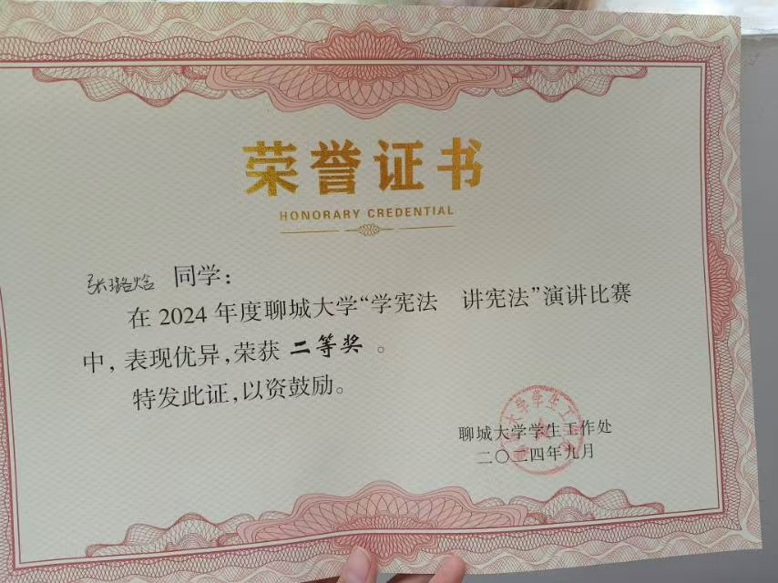 在永利近期举办的“学宪法,讲宪法”演讲比赛中,永利学生张璐焓凭借其出色的演讲能力荣获了二等奖。这一荣誉不仅是对张璐焓同学个人努力的肯定,更是对永利对学生素质培育的极大认可。    张璐焓同学自入学以来,就以其积极向上的态度和全面发展的素质,获得了老师和同学们的广泛赞誉。在本次“学宪法,讲宪法”演讲比赛中,张璐焓同学充分展示了自己的才华和实力。面对激烈的竞争,她以稳定的心态和出色的表现,赢得了老师们的一致好评。其演讲主题和内容更是展现出了独特的思维视角和卓越的分析能力。成功并非偶然,而是其多年来努力和坚持的结果。在追求卓越的道路上,她刻苦钻研,勤奋好学,始终保持着谦虚好学的态度,不断向他人请教和学习。同时,张璐焓同学还积极参加各种实践活动,乐于助人,关心集体,积极参与志愿服务活动,努力提升自己的综合素质,用实际行动践行着社会责任。这种德才兼备的品质,使得她在校园内外都赢得了广泛的称赞。