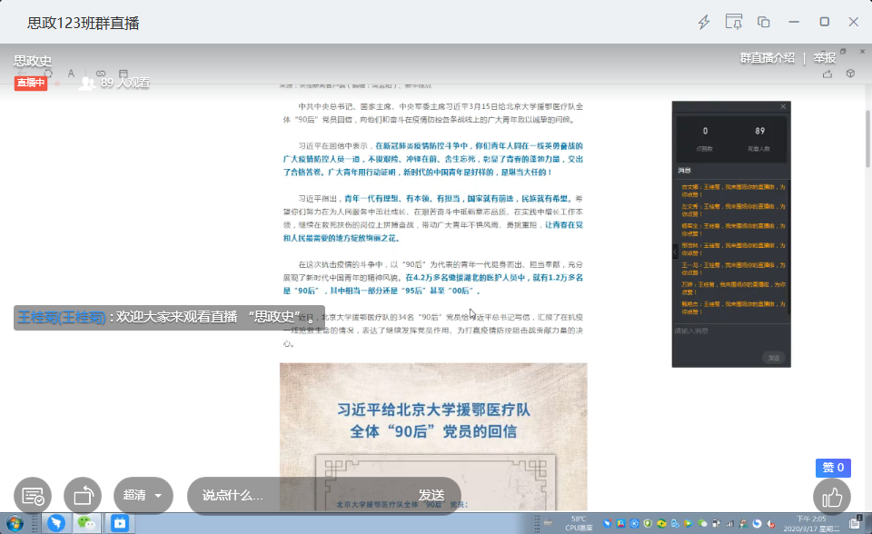 “青年一代有理想、有本领、有担当,国家就有前途,民族就有希望。”315日,习近平总书记给北京大学援鄂医疗队全体“90党员回信,向他们和奋斗在疫情防控各条战线上的广大青年致以诚挚的问候,引发了广大青年学子的热烈反响。为深入贯彻好习近平总书记回信精神,近日,永利集团88304官网组织学生借助腾讯会议、钉钉、微信公众号等网络平台学习和交流习近平总书记给北京大学援鄂医疗队全体90后”党员的回信。