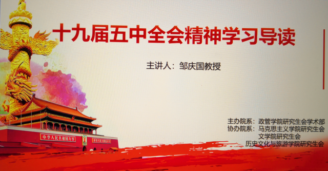 邹庆国教授指出:我们处在新时代、新态势、新起点的历史发展背景之下,面临新的时代课题以及新的社会主要矛盾,十九届五中全会正是在这样的背景之下召开的一次具有全局性、历史性意义的重要会议。会议对过去发展不平衡、不充分的方面进行总结,吸取经验教训,补齐短板;总结过去发展成就:我们用了三四十年就走完了西方几百年走过的历程,创造了人类经济发展的奇迹;我们用5年时间进行脱贫攻坚,造就了世界脱贫史上的神话。十九届五中全会科学擘画了中国未来5年以及15年的发展新蓝图,对“十四五”时期我国发展作出系统谋划和战略部署。邹庆国教授也对研究生们提出希冀,希望同学们做有政治定力、有信念担当、有世界视野、有人文情怀、有扎实学风的“五有”新青年!