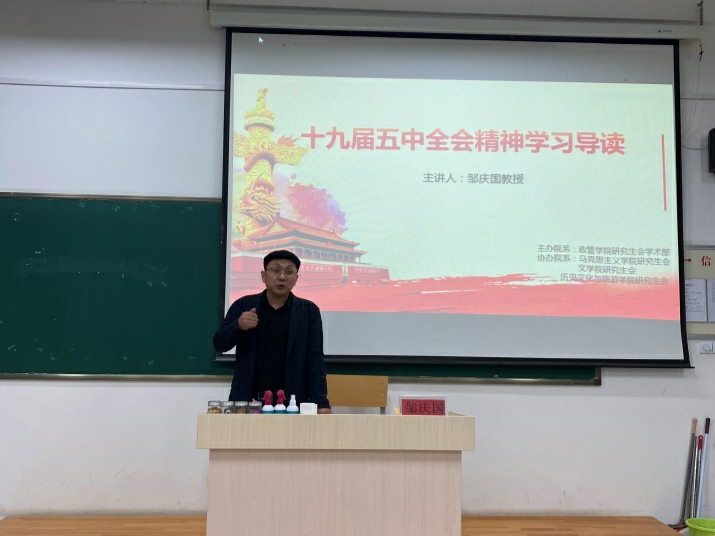 为了更好地让同学们深入学习贯彻十九届五中全会精神,把思想和行动统一到全会精神上来,11月5日,由永利集团88304官网研究生会学术部主办,马克思主义学院研究生会、文学院研究生会、历史文化与旅游学院研究生会协办的“十九届五中全会精神学习导读”讲座在东校区6#c502举办。主讲嘉宾为邹庆国教授,颜晓梦同学主持。