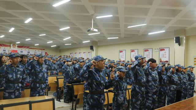 青春学子步履昂扬,目光并向党旗东方。同学们身着军装,展示出青年的意气风发、英姿飒爽。在主持人一声号令下,全体成员起立,面对鲜艳的团旗,右手握拳,手举过肩,以最宏亮的声音进行庄严宣誓,同学们的话语铿锵有力、充满激情,充分体现出作为共青团员的精神风貌。激昂的宣誓过程中,同学们用誓词表达了对共产主义青年团组织的无限向往和为团组织增光添彩的豪迈激情。团员代表李子川号召同学们从现在开始,要在各个方面严格要求自身,认真履行团员义务,坚定理想信念,牢记入团誓词,争做优秀团员。同学们也纷纷表示会在生活与学习中贯彻落实团员誓词的要求,用良好的一言一行践行誓词,团结奋进、锐意进取,承担起自身担负的社会责任,不负党和人民的期许。
