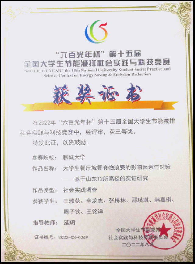 通过此次节能减排社会实践活动,增强了大学生的节粮观念,加强团队之间团结合作、互助共赢的精神,为山东省各个高校起到了资政反馈的作用,充分展示了团队节能减排理论与实践结合的创新成果,为实现双碳目标集聚创新力量。