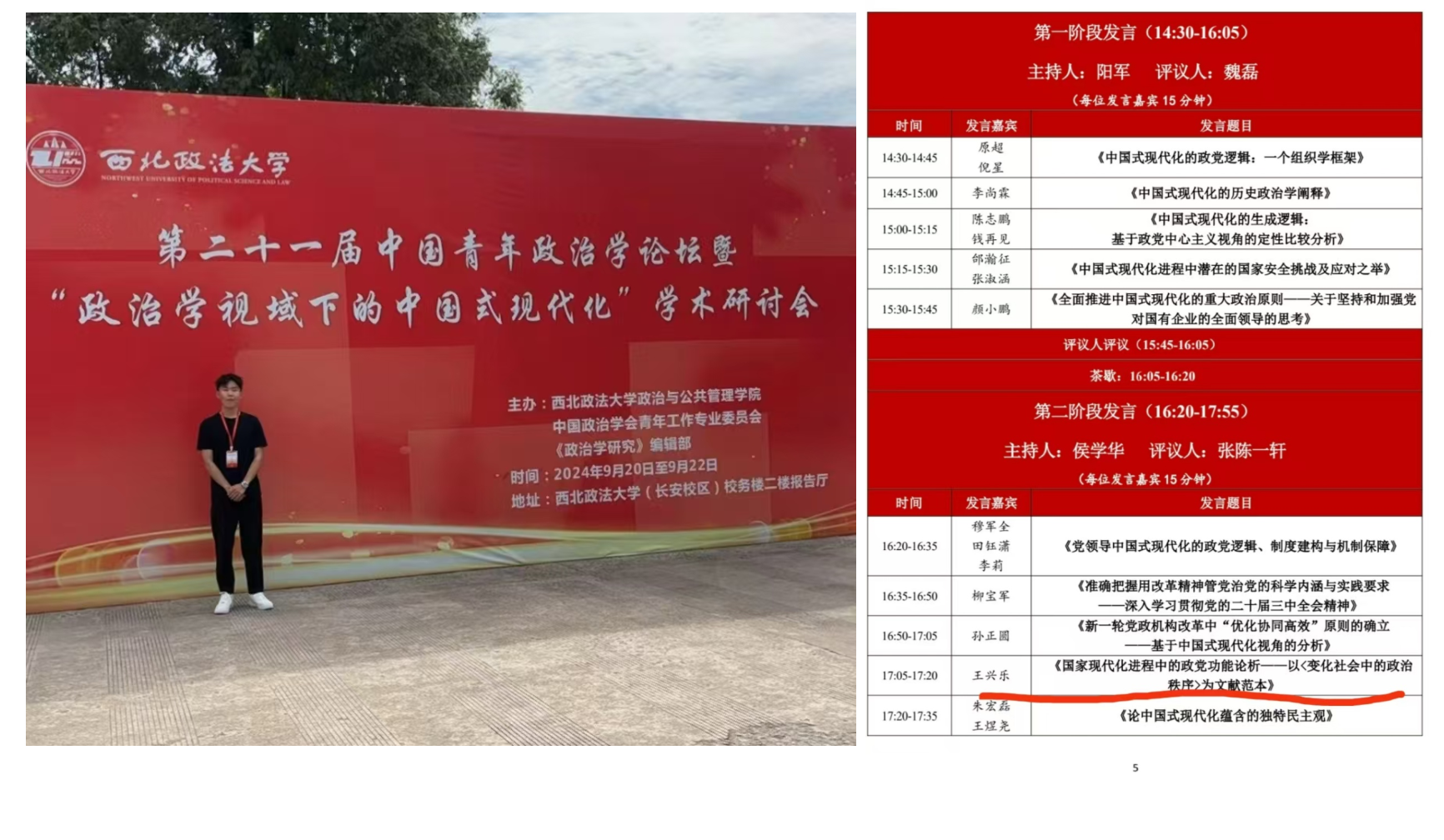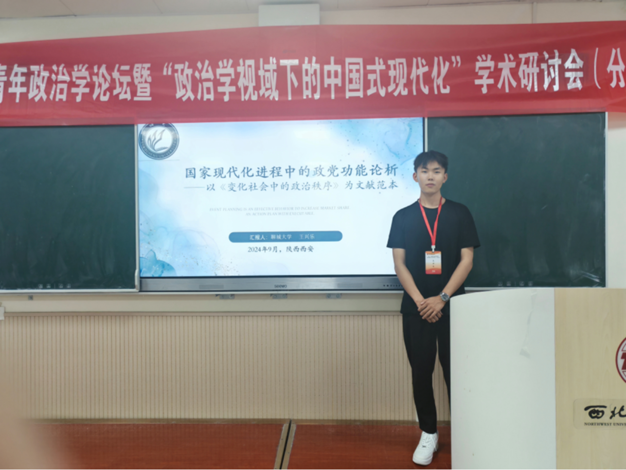 2024年9月20日—22日,由中国政治学会青年工作委员会、西北政法大学与《政治学研究》编辑部联合主办的“第二十一届中国青年政治学论坛暨‘政治学视域下的中国式现代化’学术研讨会”在陕西西安举行,永利2023级政治学研究生王兴乐撰写的论文《国家现代化进程中的政党功能论析——以<变化社会中的政治秩序>为文献范本》成功入选,并现场参加本届论坛。论文汇集了来自清华大学、复旦大学、南开大学、天津师范大学等全国各高校的专家学者,围绕政治学的发展与中国式现代化及其相关领域的最新研究成果展开了深入交流与探讨。