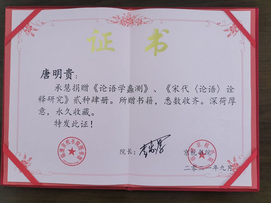 本次活动主要针对教学实习实训基地建设、校外社会实践教育和文化教育基地建设情况进行交流。唐明贵向临清京杭书院图书馆捐赠《论语学蠡测》、《宋代〈论语〉诠释研究》贰中肆册,并现场颁发证书,唐明贵发表致辞,表示感谢,表达了愿意为促进两地文化交流作出努力。现场嘉宾对其表示祝贺,并一起期待更进一步的交流与合作,促进彼此的共同发展。