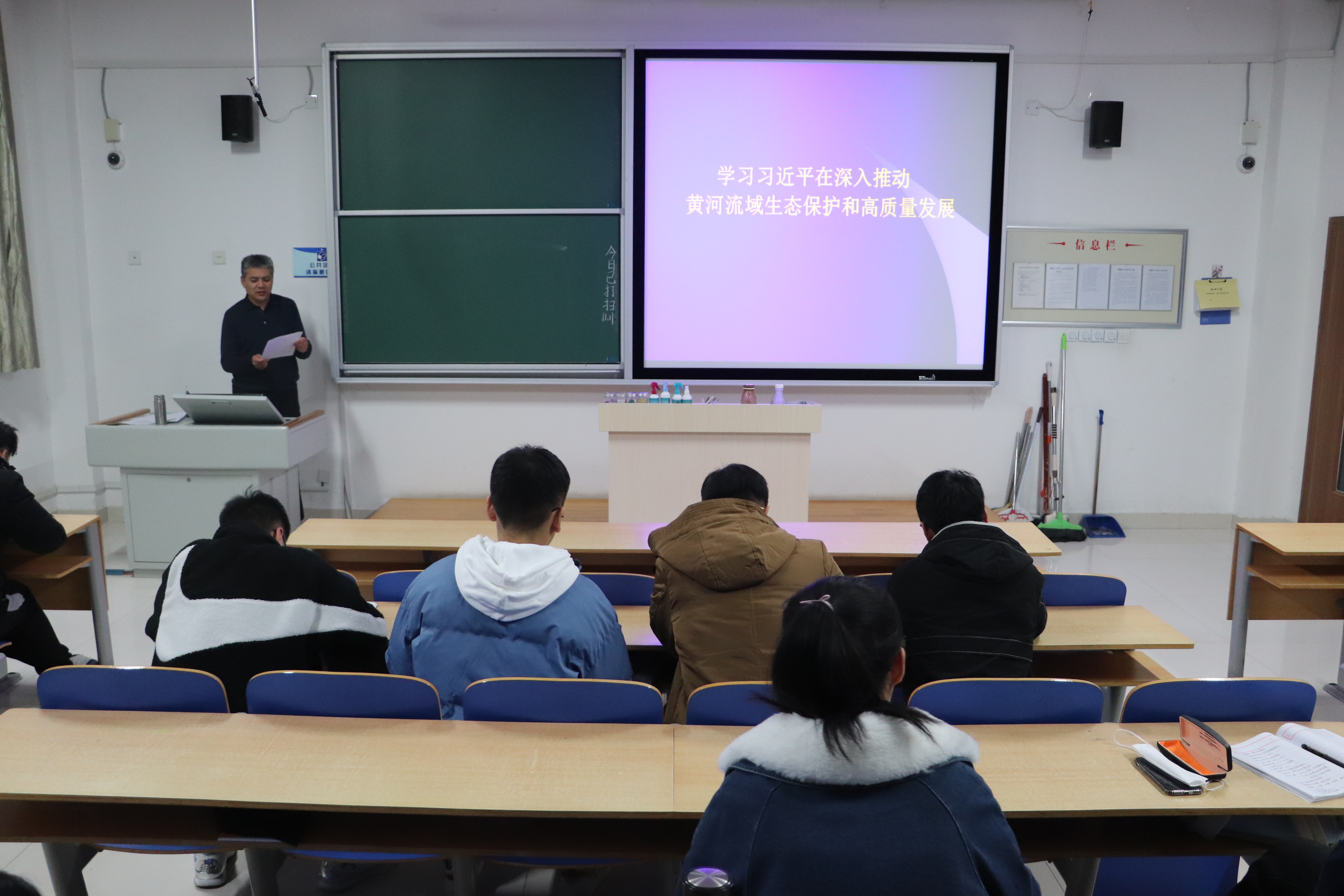 此次学习活动由政管学院副处级组织员陈新担任主讲人,陈新围绕习近平总书记重要讲话背景以及内容进行介绍,阐述了讲话的重要意义。陈新指出,习近平总书记的讲话指明了现阶段黄河流域面临的问题及解决对策,对于推动黄河上、中、下各流域生态保护和高质量发展必将发挥重大指导作用。各级党委政府在讲话精神指引下,坚持问题导向,有序落实任务,能够给黄河流域人民带来更多的发展实惠,增强其生活的幸福感。同时,他提出,要切实把习近平总书记讲话精神转化为教育领域的动力和成效,要求广大学生积极投身到涉及黄河流域的社会实践与志愿公益中,凝心聚力、共谋发展。