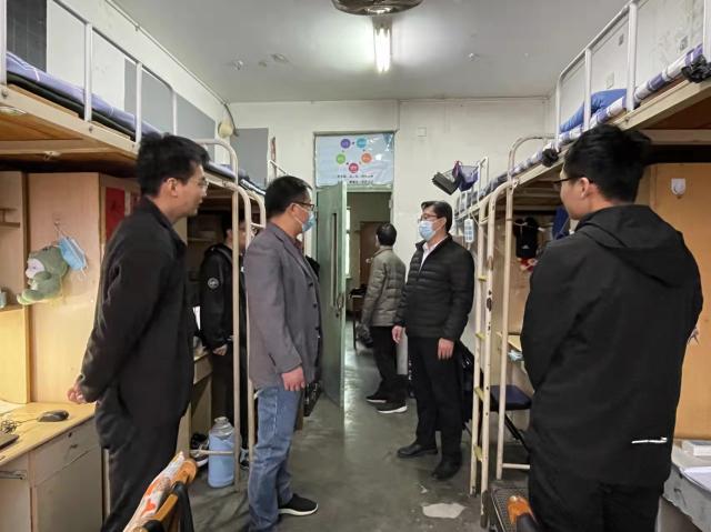 李士峰等一行首先来到了群星公寓20#,询问同学们的宿舍生活状态和网课学习情况,查看卫生消杀情况,监督完善消杀记录,并对同学们的生活习惯和宿舍环境提出了建议。随后前往群星公寓14#,李士峰强调,同学们应该建立良好的生活作息规律,平衡网课与日常锻炼的时间,提前做好恢复线下教学的准备,端正网课学习态度,注意宿舍消杀通风,积极配合学院疫情防控工作。在到达群星公寓5#研究生宿舍时,乔华军询问了研究生论文写作进度,给予相关经验,并就同学们的部分学习生活习惯进行指导。慰问团积极引导同学们改善宿舍环境,保证学习氛围,为线下复学做出充分准备。