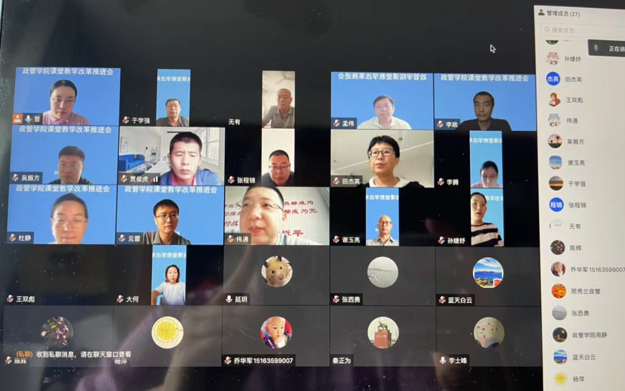 为贯彻落实山东省教育厅《关于推动课堂教学改革全面提高普通本科高校人才培养质量的通知》文件精神,有序推进课堂教学改革顺利实施,7月20日,政管学院举行本科课堂教学改革推进会。会议通过线上腾讯会议的形式进行。学院领导班子和全体教师参加了会议。会议由副院长刘晋主持。