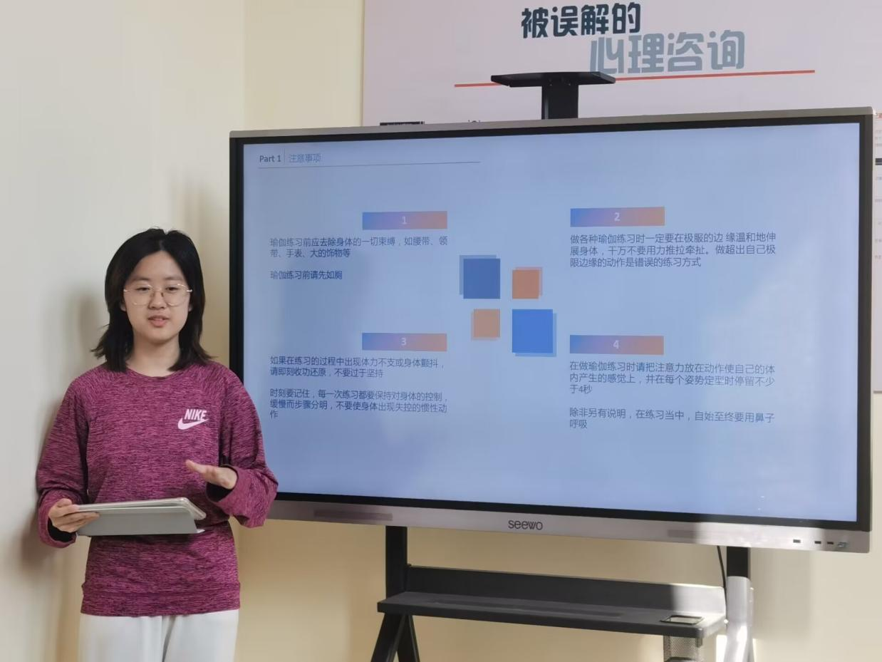 主讲人刘雅琪分别从“瑜伽是什么”、“瑜伽的益处”、“如何看待以及练习瑜伽”和“具体注意事项”四个方面展开详细叙述。刘雅琪通过PPT讲解介绍,把瑜伽当作一种以一定心理实践为基础的生活哲学,能够发展身心之间的理想平衡,从而有效缓解压力和紧张感,获得力量、柔韧性和平衡性,有利于提高同学们的身体能量和精神能量。刘雅琪着重讲述对瑜伽的认识误区,引导同学们用正确的姿势做瑜伽活动,确保同学们在练习过程中避免受伤,帮助同学们提高身体柔韧性、促进身体生长发育。在讲解完练习瑜伽的注意事项后,刘雅琪带领同学们练习简易坐、至善坐、雷电坐、山式和拜日式站姿等动作,伴随舒缓的轻音乐,同学们在冥想中放松自己,纾解压力,享受瑜伽带来的舒适感。在交流分享环节,参与者于烨凡表示,在此次活动中深刻感受到瑜伽的魅力,身心得到充分的放松。不仅有助于增强身体素质,还可以学会如何在生活中调整心态。