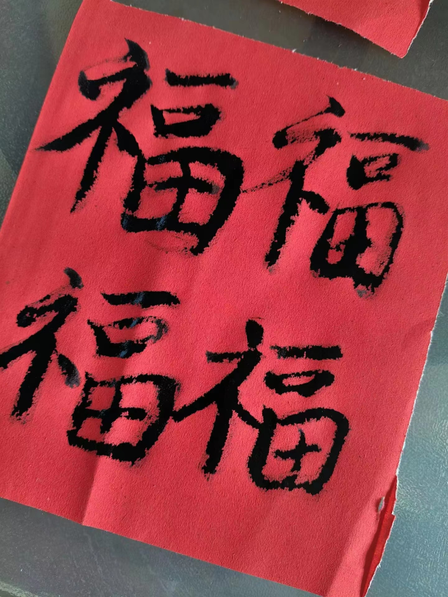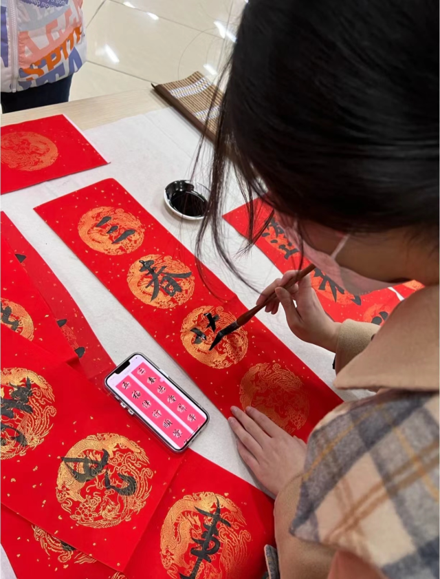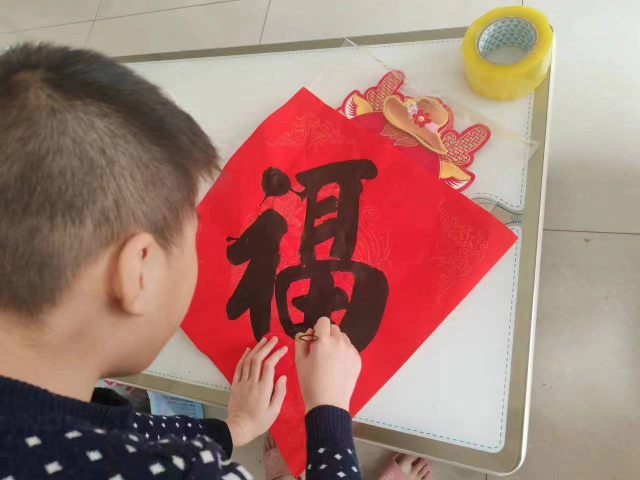 志愿者们自己动手写“福”字,祈求来年幸福平安,表达对美好生活的向往和期盼,同时感受中国书法艺术的魅力,传承中华优秀传统文化。