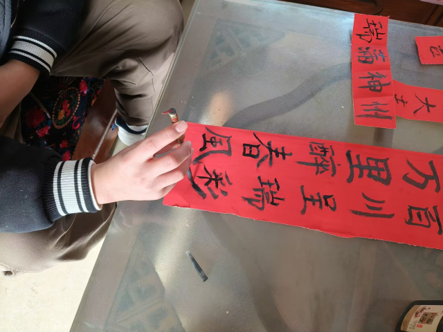 志愿者们手写春联,当写满新春祝福的对联跃然纸上,于黑墨红纸间传扬着中华民族传统文化的独特魅力,续写着对龙年的美好祝愿。