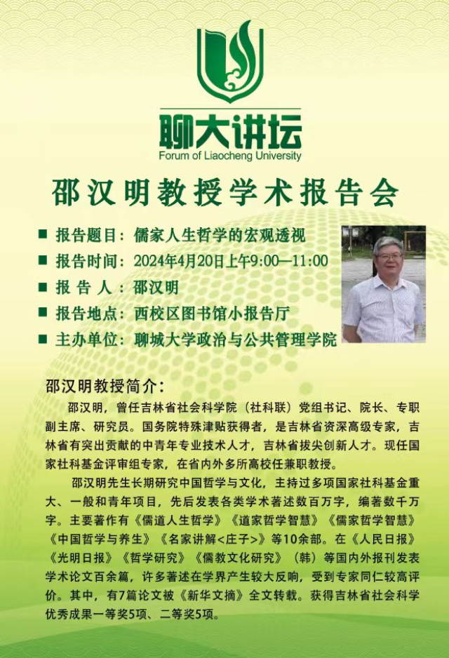 4月20日上午9点,吉林省社会科学院原院长、国家社科基金评审专家邵汉明教授莅临永利西校区图书馆小报告厅,为政管学院的师生们带来了一场题为《儒家人生哲学的宏观透视》的精彩讲座。